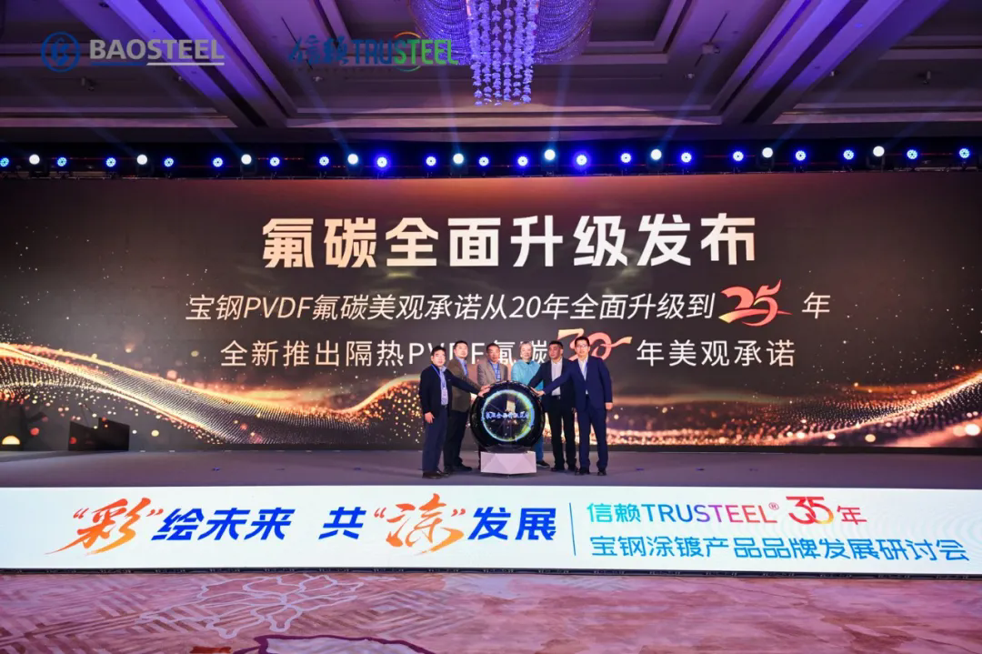 在與會嘉賓的共同見證下,寶鋼鄭重宣布對氟碳彩涂產品的質量承諾實現(xiàn)跨越式提升:將已堅守二十余年的20年質保標準,一舉提升至25年。與此同時,寶鋼更進一步,同步推出了具備優(yōu)異隔熱性能的 “隔熱氟碳30年” 全新標準。