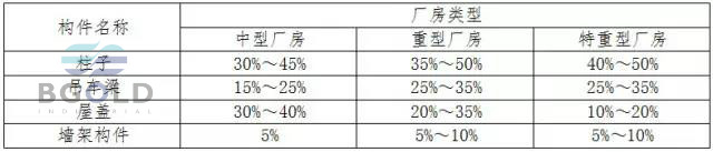 各種構件的用鋼量占整個廠房鋼結構的總用鋼量的比值大致如表所示。