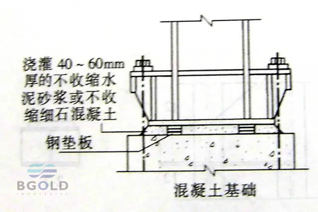 a.  墊板應設置在靠近地腳螺栓的柱腳底板加勁板下,每根地腳螺栓側應設1~2組墊板。墊板與基礎面得接觸應平整、緊密。二次澆灌混凝土前墊板組間應點焊固定。
