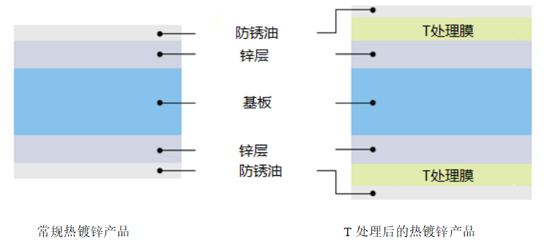 熱鍍鋅鋼板因其具有優(yōu)越的耐腐蝕性能與表面質(zhì)量,及良好的焊接性與涂裝性,成為中高檔乘用車鋼板的主流材料。由于鍍鋅層的特性,普通熱鍍鋅板在沖壓成形時(shí),容易產(chǎn)生鋅層表面劃傷、粉化脫落、模具粘鋅現(xiàn)象,沖壓穩(wěn)定性較差,影響沖壓件表面質(zhì)量。故此為滿足國內(nèi)外用戶需求,寶鋼在國內(nèi)率先開發(fā)了無機(jī)固體自潤滑處理(T處理),該產(chǎn)品通過表面輥涂處理方式,在熱鍍鋅材料鋅層表面形成超薄的“無機(jī)自潤滑層”。