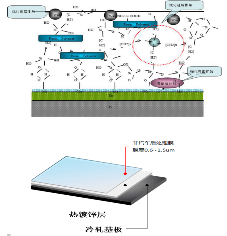 目前湛江冷軋能生產(chǎn)的產(chǎn)品有鈍化、耐指紋以及家電自潤滑三種,膜厚從0.6~1.5um不等,綠色環(huán)保,其結(jié)構(gòu)皆以硅烷基來作為骨架,有機(jī)物作為主要填充物,加入性能改良物質(zhì)如表面耐磨劑等改善所需的性能指標(biāo),膜結(jié)構(gòu)圖和斷面示意圖如下: