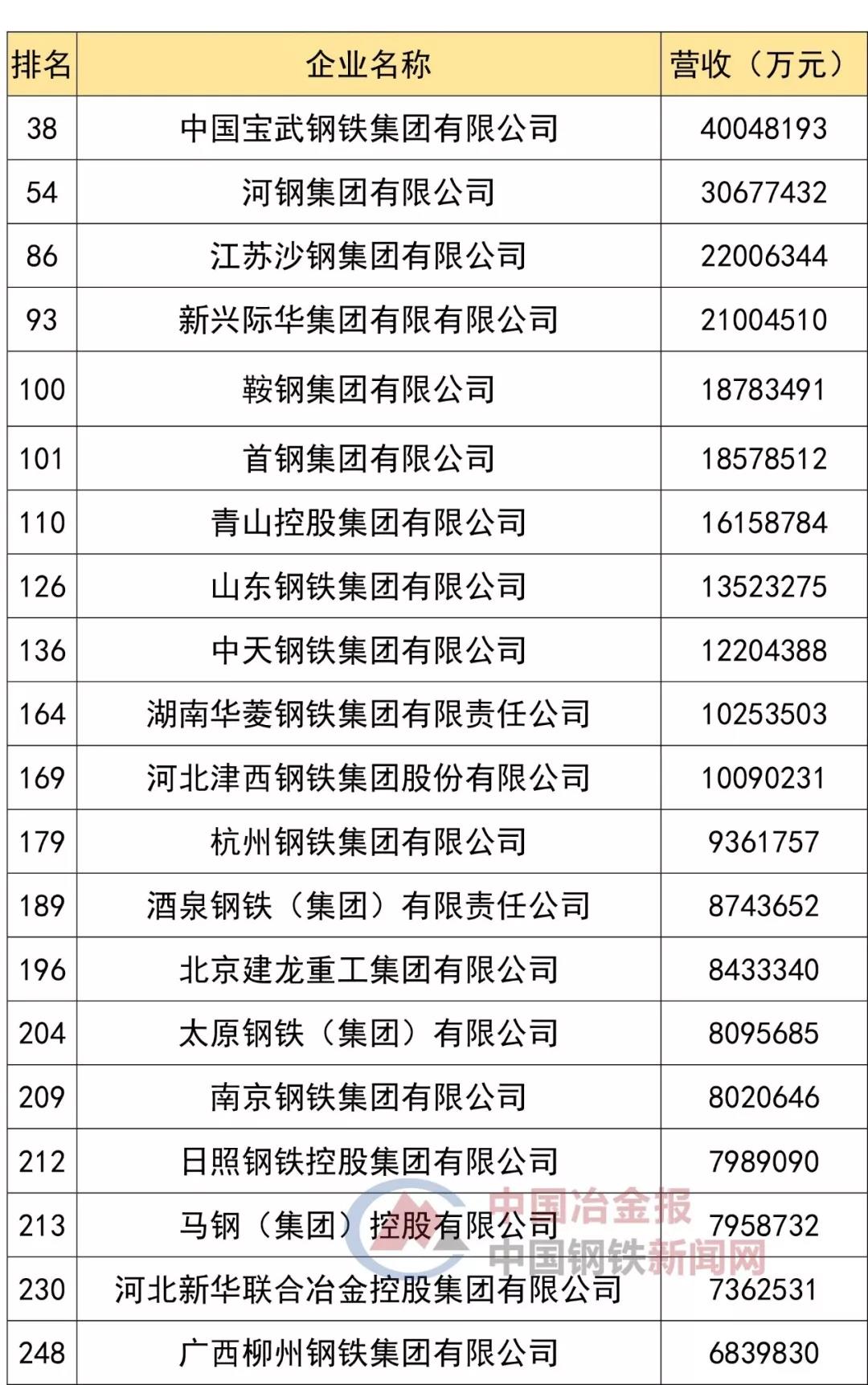 9月2日,由中國企業(yè)聯(lián)合會(huì)、中國企業(yè)家協(xié)會(huì)連續(xù)第17次向社會(huì)公開發(fā)布的“中國企業(yè)500強(qiáng)”排行榜今日在西安揭曉。47家鋼鐵企業(yè)入選。其中中國寶武、河鋼集團(tuán)、沙鋼集團(tuán)分別以營收4004億元、3067億元、2200億元位居鋼鐵板塊前三名。在500強(qiáng)榜單中,分別排名為38位、54位、86位。